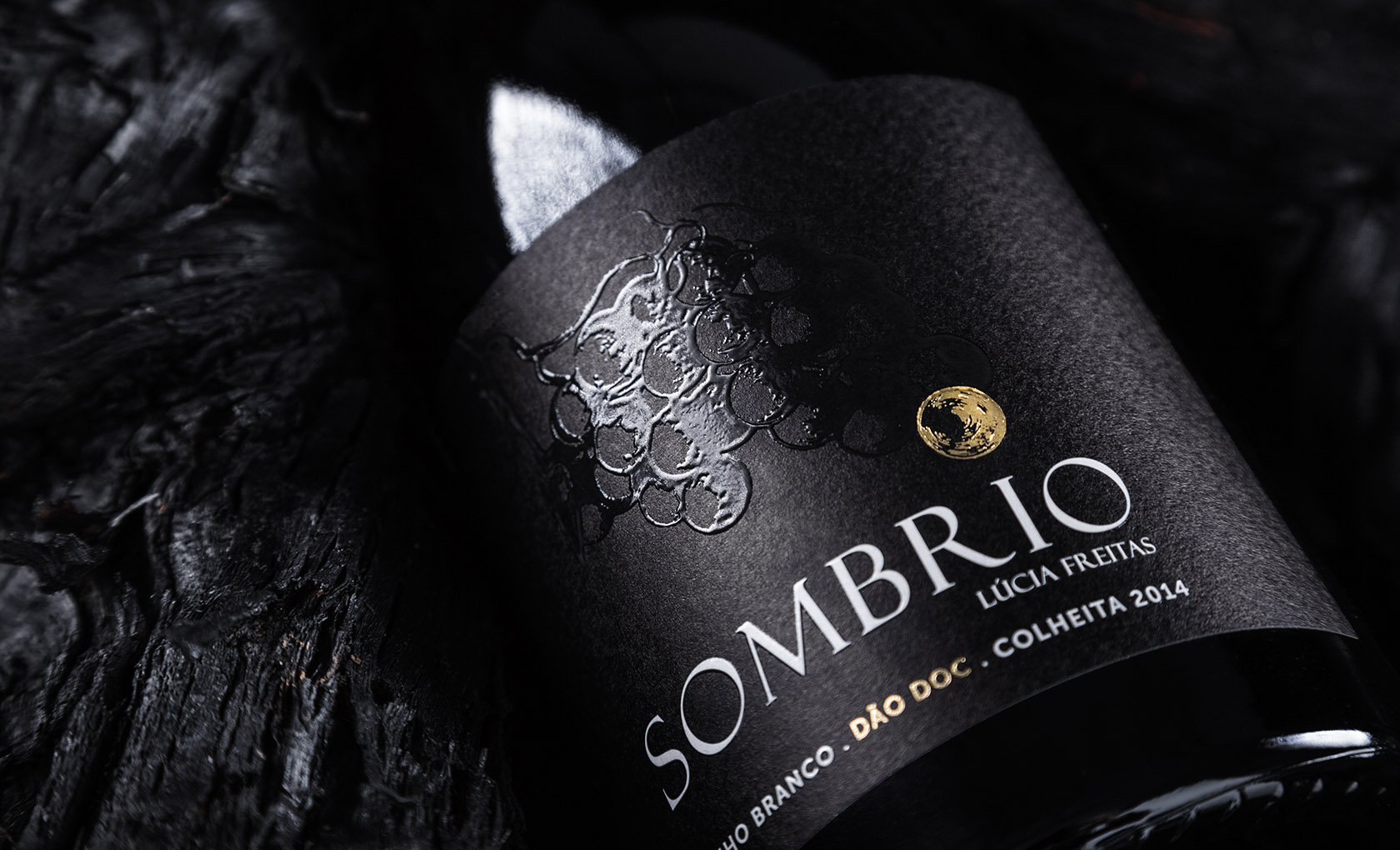 O último bago destaca-se: é uma lua dourada com estampagem a ouro, estrategicamente colocada sobre o “i” da palavra Sombrio. O processo de vinificação sem luz evita a oxidação e a garrafa em vidro escuro, embrulhada em papel preto, ajuda a cumprir o objetivo ao permitir que o vinho só contacte com a luz quando servido no copo. O gargalo é selado com lacre.